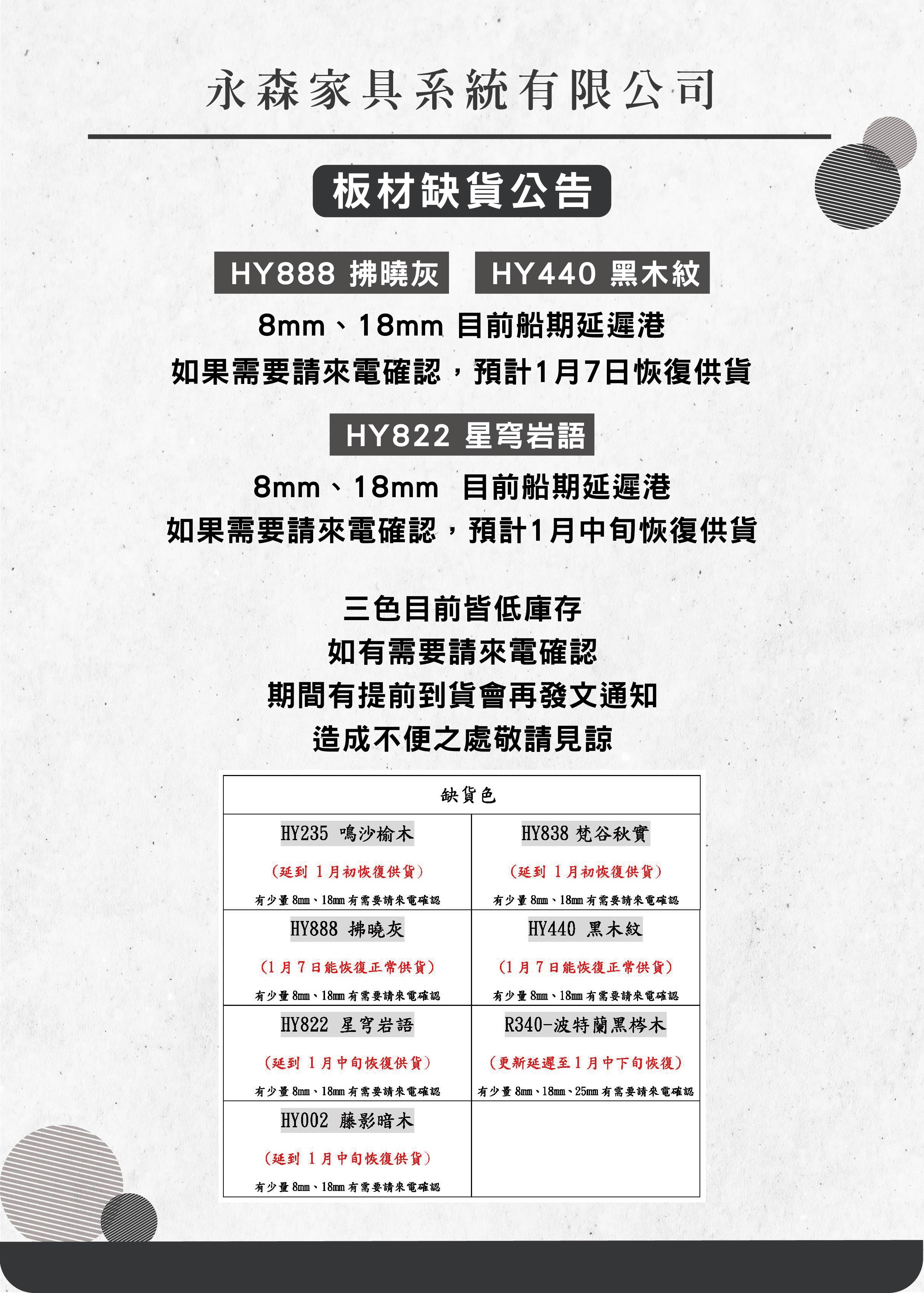 【板材資訊】缺貨公告